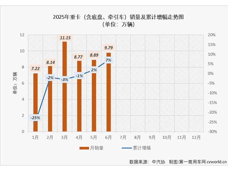 2025年6月份,重卡市場整體銷量接近10萬輛,同比實現37%的增長。此前已連續三個月跑輸重卡市場“大盤”的牽引車市場能否同步實現大增?跑贏還是跑輸?2025年已然過半,牽引車行業格局又有何變化?請看**商用車網的分析報道。6月銷售4.9萬輛,環比增長12%,同比增長31%**商用車網*新獲悉,根據中汽協數據(企業開票數口徑,非終端實銷口徑,下同),2025年6月份,我國重卡市場共計銷售9.79萬輛,環比增長10%,同比增長37%。這其中,作為重卡市場中*受關注的細分領域,牽引車市場在6月份同步實現增長,交出的成績單為:銷售4.89萬輛,環比增長12%,同比增長31%,同比增幅較上月(+0.2%)大幅擴大,但低于重卡市場整體增速,繼續跑輸重卡市場“大盤”。縱觀近五年6月份牽引車市場銷量及增幅走勢圖,*近五年的6月份,牽引車市場走出一個降-降-增-降-增的走勢(與重卡市場整體走勢相同),五年中有三年6月份銷量超過4萬輛,其中2021年6月份銷量達到8.15萬輛,2022年6月份出現超6成大降,跌至不足3萬輛水準;隨后2023年6月份和2024年6月份先后經歷近6成大增和近2成下降,2024年6月份銷量再次不足4萬輛,2025年6月份牽引車市場同比增長31%,4.89萬輛的銷量在近五年里排第二位,比五年*高的2021年6月份少銷售約3.3萬輛,比去年6月份凈增長超1.1萬輛。 從累計銷量看,2025年1-6月,牽引車市場累計銷售27.02輛,在近五年里看同樣是第二高,但其實與前兩年處于同一水平,比去年1-6月的26.58萬輛小幅增長2%,凈增長4000余輛,累計銷量增幅重回上升區間(如上圖)。 重汽超萬輛蟬聯月榜**,徐工/遠程繼續翻倍大漲2025年6月份,牽引車市場同比增長31%,同比增幅較上月大幅擴大(5月份牽引車市場同比增長0.2%)。6月份,牽引車市場繼續僅有1家企業銷量超過萬輛,月銷萬輛企業數與上月持平。重汽銷售1.18萬輛,蟬聯牽引車月榜**。2025年6月份牽引車市場銷量表(單位:輛)從同比增幅看,6月牽引車銷量排行前十企業9增1降,重汽、解放、陜汽、東風、福田、徐工、遠程、北汽重卡、江淮同比分別增長了29%、44%、35%、21%、69%、233%、128%、127%和81%,徐工、遠程等企業已連續多月實現翻倍增長;**下滑的企業6月份銷量同比下降了15%。從同比增幅來看,6月份的牽引車市場仍是有人歡喜有人愁,不過“歡喜”的企業是大多數。 從市場份額看,6月份,牽引車市場銷量前十企業合計份額達到98.80%,其中銷量排名前五企業合計份額就達到88.97%,行業前五企業6月份份額均超過10%,其中排名榜首的重汽月度份額接近25%,達到24.14%;解放、陜汽、東風和福田6月份份額分別為20.14%、18.53%、14.51%和11.64%;排名6-10位的徐工、遠程、北汽重卡、江淮和宇通月度份額在0.6-5%之間。 從行業格局看,2025年6月份牽引車市場行業前十成員與5月份一致,排名出現一些變化:遠程上升一位至月榜第7位(遠程5月份排名月榜第8位);北汽重卡上升一位至月榜第8位(北汽5月份排名月榜第9位);排名月榜前6位的重汽、解放、陜汽、東風、福田和徐工,以及第10位的宇通保持5月份排名不變。1-6月累銷超27萬輛,徐工/遠程領漲,福田份額大增從累計銷量看,今年1-6月,牽引車市場累計銷售27.02萬輛,同比增長2%,累計銷量增幅從5月過后(-3%)轉正,較去年上半年累計多銷售約4400輛。具體到累計銷量前十企業來看,大多數企業都實現增長(8增2降,如上圖)。其中,徐工和遠程累計銷量同比分別大增189%和113%,實現翻倍增長;福田和北汽重卡累計銷量同比分別增長47%和63%,也能算到大增范疇;重汽、陜汽、東風和江淮等企業累計銷量同比分別增長5%、9%、2%和27%。與此同時,累計銷量前十企業中有2家處于下降區間,下滑*嚴重的企業累計銷量同比下降了12%。從累計份額看,牽引車累計銷量前十企業合計份額達到99.04%,排名前兩位的重汽和解放累計份額均超20%,分別達到26.96%和21.64%;排名3、4位的陜汽和福田累計份額分別達到16.96%和12.43%;暫列第5位的東風累計份額也超過10%,達到12.42%,行業TOP5企業合計份額高達90.41%,**優勢巨大;排名6-10位的徐工、遠程、北汽重卡、江淮和宇通累計份額在0.4-4%之間。與去年同期相比,重汽、陜汽、福田、東風、徐工、遠程、北汽重卡和江淮等企業今年1-6月市場份額有所提升,其中福田、徐工和陜汽等3家企業提升*為明顯,分別提升了3.84個百分點、2.28個百分點和1.14個百分點。與2024年年終格局相比,今年上半年,牽引車行業前十成員和座次均發生了變化:去年牽引車排位賽*終名列第12位的宇通,目前暫列行業第10位(但宇通**累銷第11位的企業不足百輛);去年年終排名第10的遠程商用車, 6月過后暫列行業第7;去年年終排名第5位的福田今年6月過后暫列行業第4;去年年終排名第7位的徐工上升一位,暫列行業第6。“你進我退”中也有企業排名出現下滑,甚至被擠出前十。不過2025年的進度條剛過半,落后的企業還有追上來的機會。結語2025年6月份,重卡市場整體銷量同比實現37%的增長,牽引車市場同比增長31%,連續四個月跑輸重卡市場“大盤”;今年上半年,重卡累計銷量同比增長7%,牽引車市場2%的累計增幅同樣跑輸。下半年,牽引車市場何時能跑贏重卡市場大盤?請關注本站后續報道。